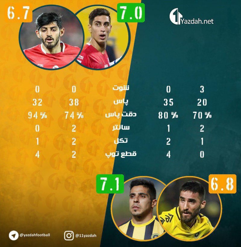 بر اساس آمارهای ثبت شده از سوی سایت آنالیز یازده مهدی ترابی که در سیستم 2-4-4 لوزی پرسپولیس جلوتر از محمد نادری در جناح چپ بازی می کرد دقت پاس بالایی داشت اما ابوالحسن جعفری در جناح راست خط دفاعی سپاهان به خوبی در برابر مهدی ترابی مقاومت کرد. او دو بار با تکل موفق توپ را از مهدی ترابی گرفت و چهار قطع توپ داشت و با این تلاش های مانع از طرح حمله پرسپولیس از سمت مهدی ترابی شد. مهرداد محمدی یکی از مهره های کلیدی سپاهان در این بازی سه بار با شوت از راه دور دروازه تیم پرسپولیس را نشانه گرفت. او در این مصاف حساس و دیدنی چند بار تصمیم به نفوذ به قلب خط دفاعی تیم پرسپولیس گرفت اما هوشیاری مدافعان پرسپولیس او را در رسیدن به گل ناکام گذاشت. در یک صحنه سید جلال حسینی به واکنش دیدنی توپ او را تصاحب کرد.